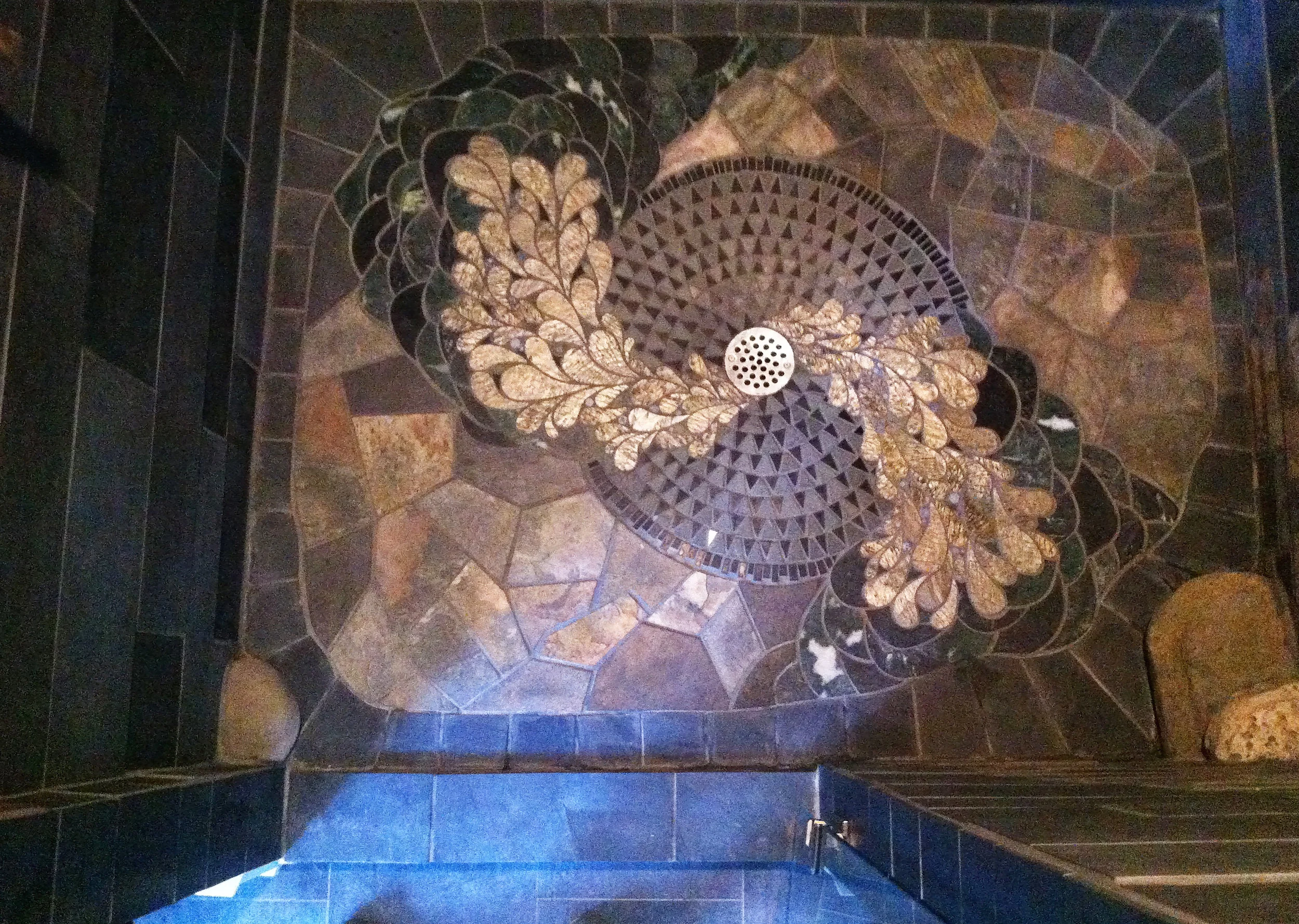 This stone shower in Danby, NY was created using a variety of natural slate and found stones. the shimmering stones emerging from the center represent the natural way water moves with the earth. The shelves were created with found stones from a nearby creek