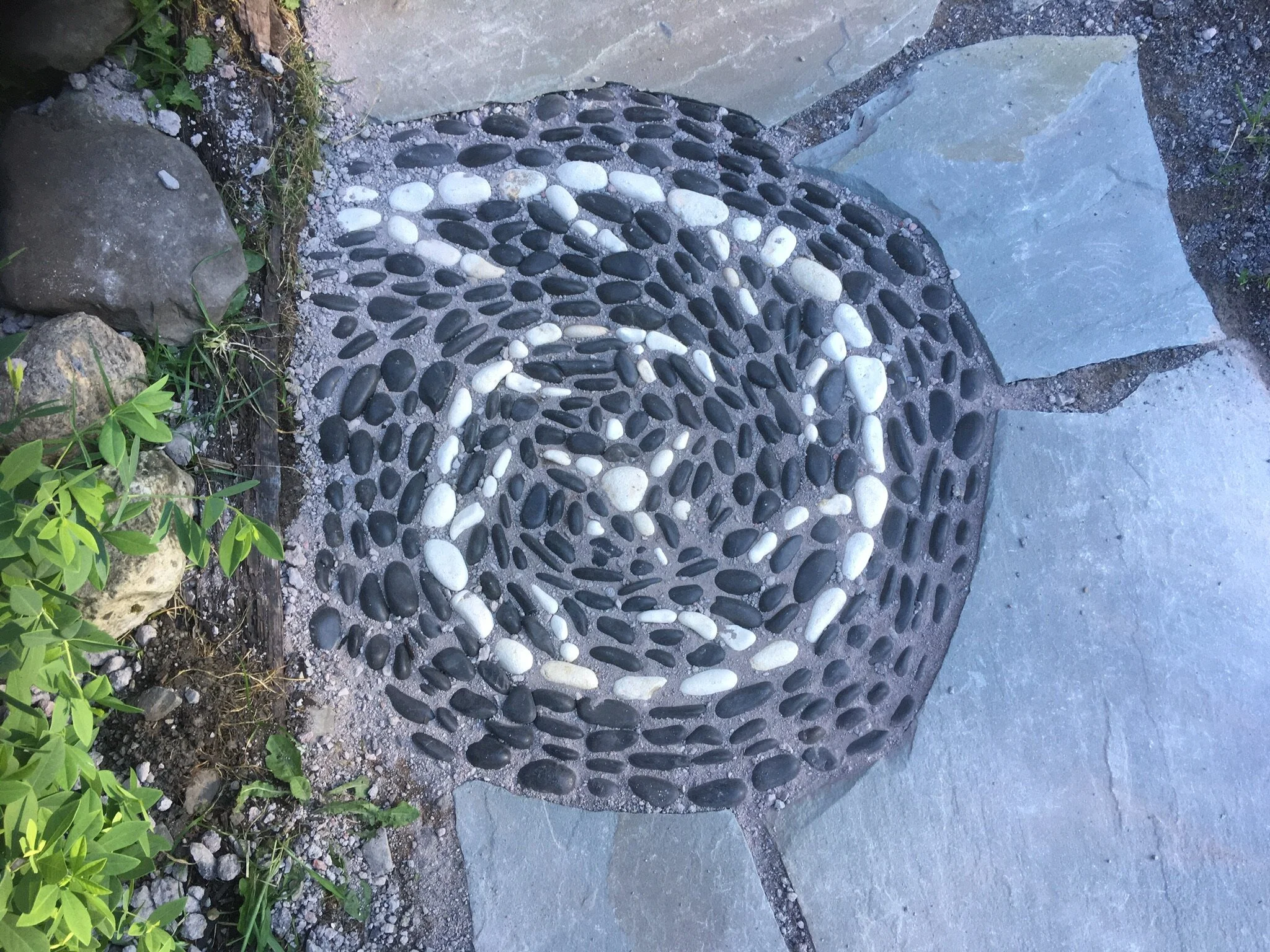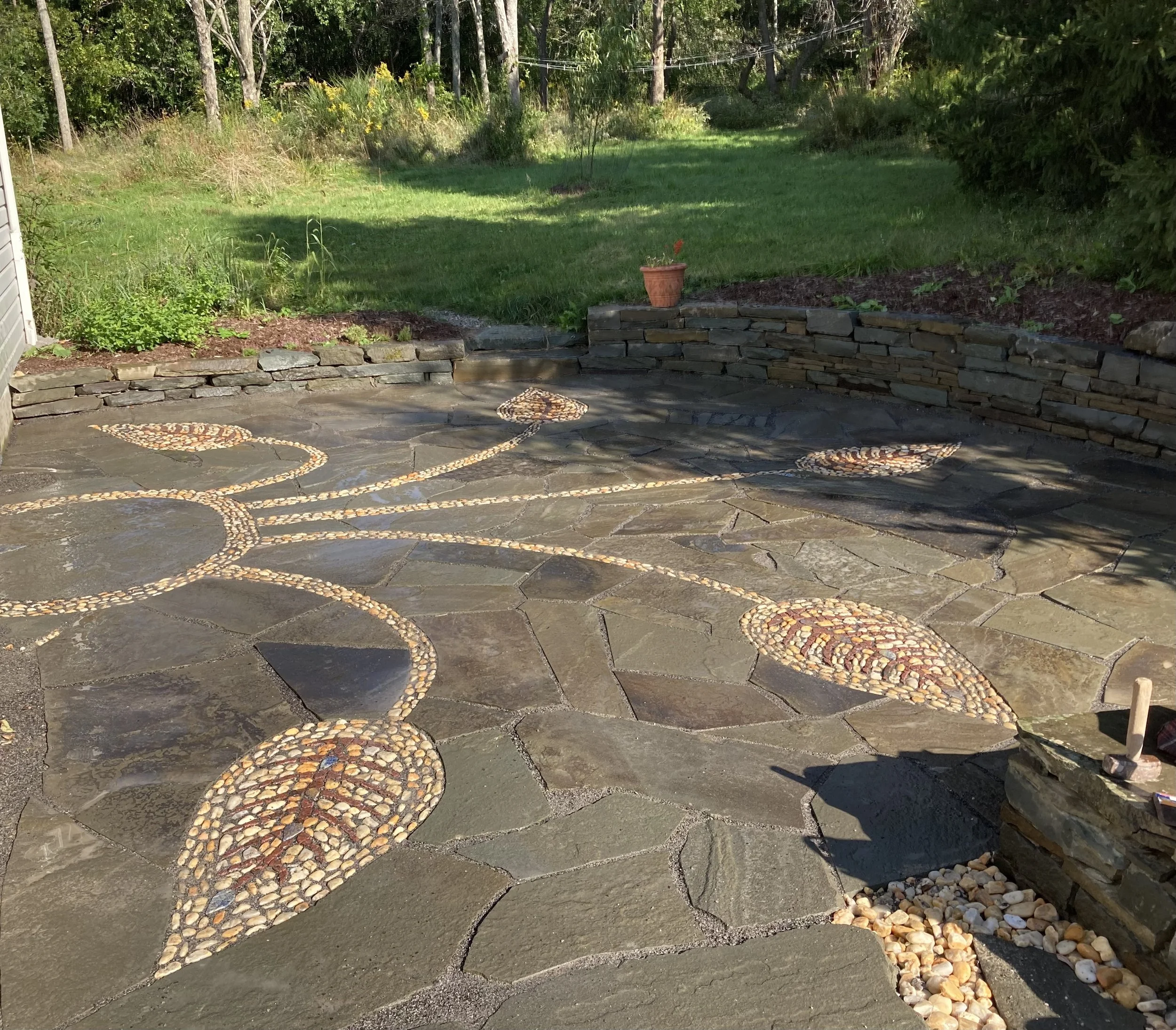 The intention for this project was to create small island patios and a winding staircase that are joined with randomly placed stepping stone paths. Small pebble mosaic designs Are centered in the larger areas. The final result blends into the landscape in a way that makes it appear it has been there for several decades