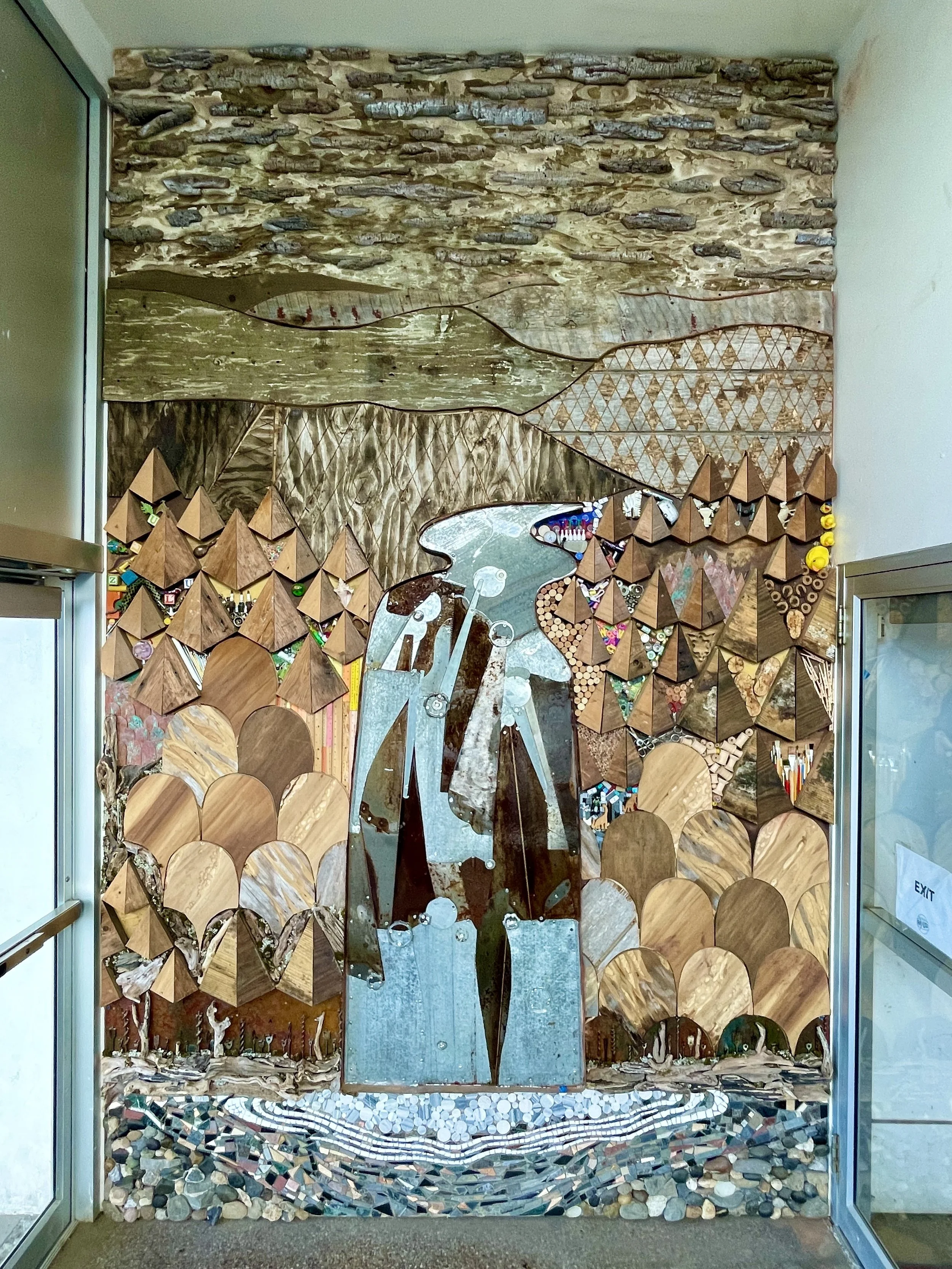 mixed media mosaic at the Finger Lakes Reuse Center in downtown Ithaca. It was part of a project with 5 artists installations reflecting themes of reuse impacts that connect to the United Nations sustainable development goals. Over the course of two years I designed, planned and collected a variety of materials to incorporate into it. I collected stones and driftwood along the shores of Cayuga lake, scraps of barn wood, tools, circuit boards and a variety of small discarded objects which I used within little pockets of the overall piece to create tiny cubbies of nostalgia. The piece as a whole when one steps back shows the landscape of a great waterfall.