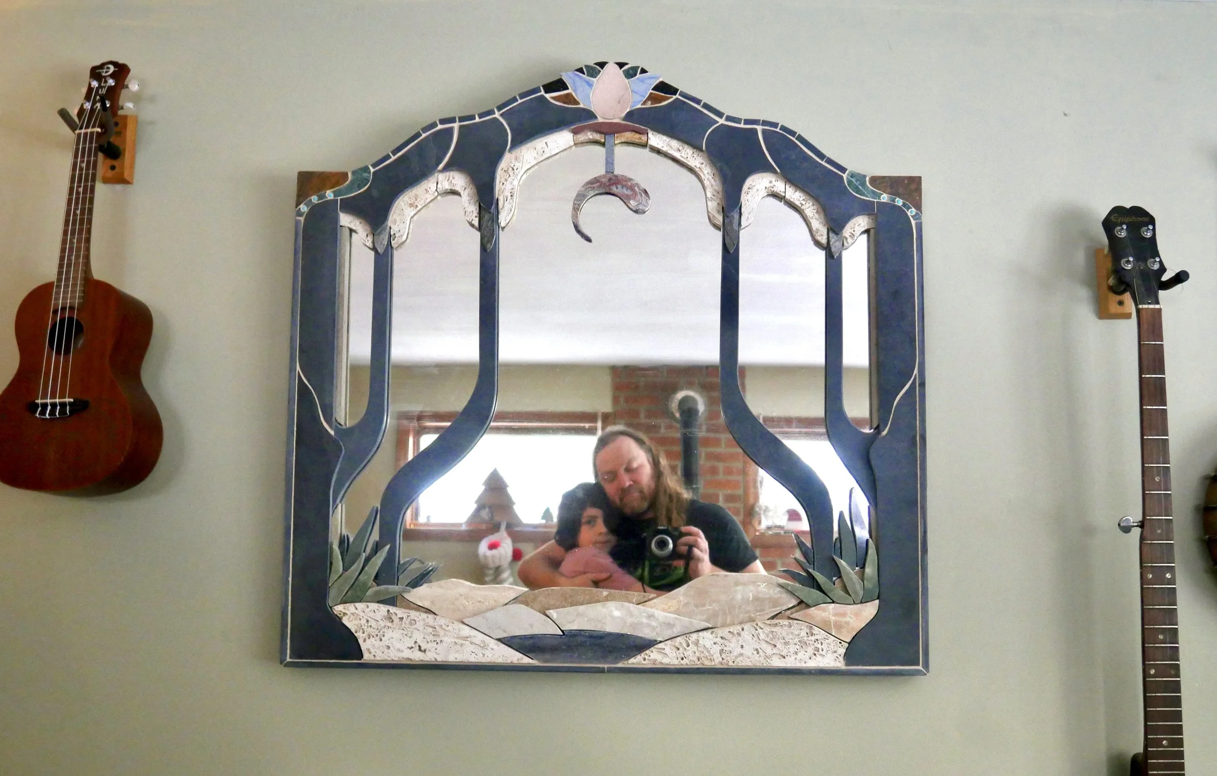 Stone mosaic mirror. Each mirror I create with the intention to meld worlds together. They are portals that hold reflections of what you know, and invite you to witness a fresh scene that seems to have a life of its own. In this way, I hope that viewers will always take away something unique and personal.