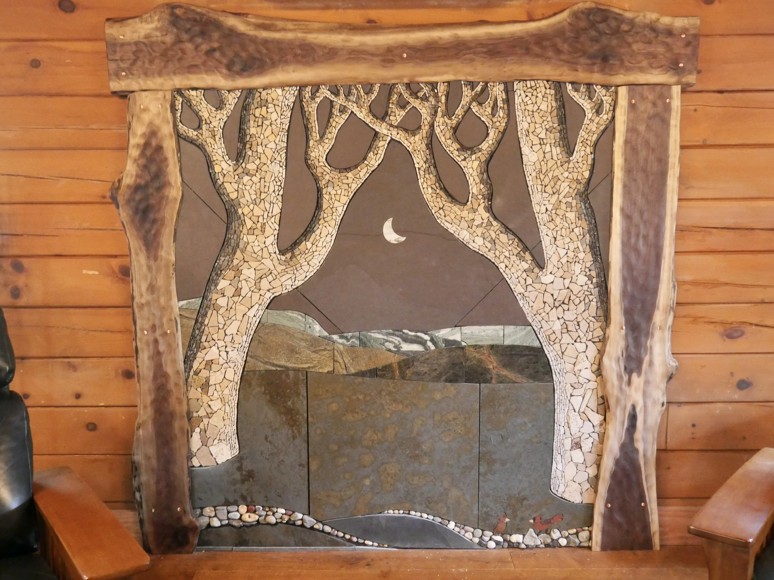 These matching waterfall themed pieces were commissioned to be installed above their beds and incorporate back lit translucent stones for the moons, barn wood, driftwood, fossil stones and semi precious gemstones