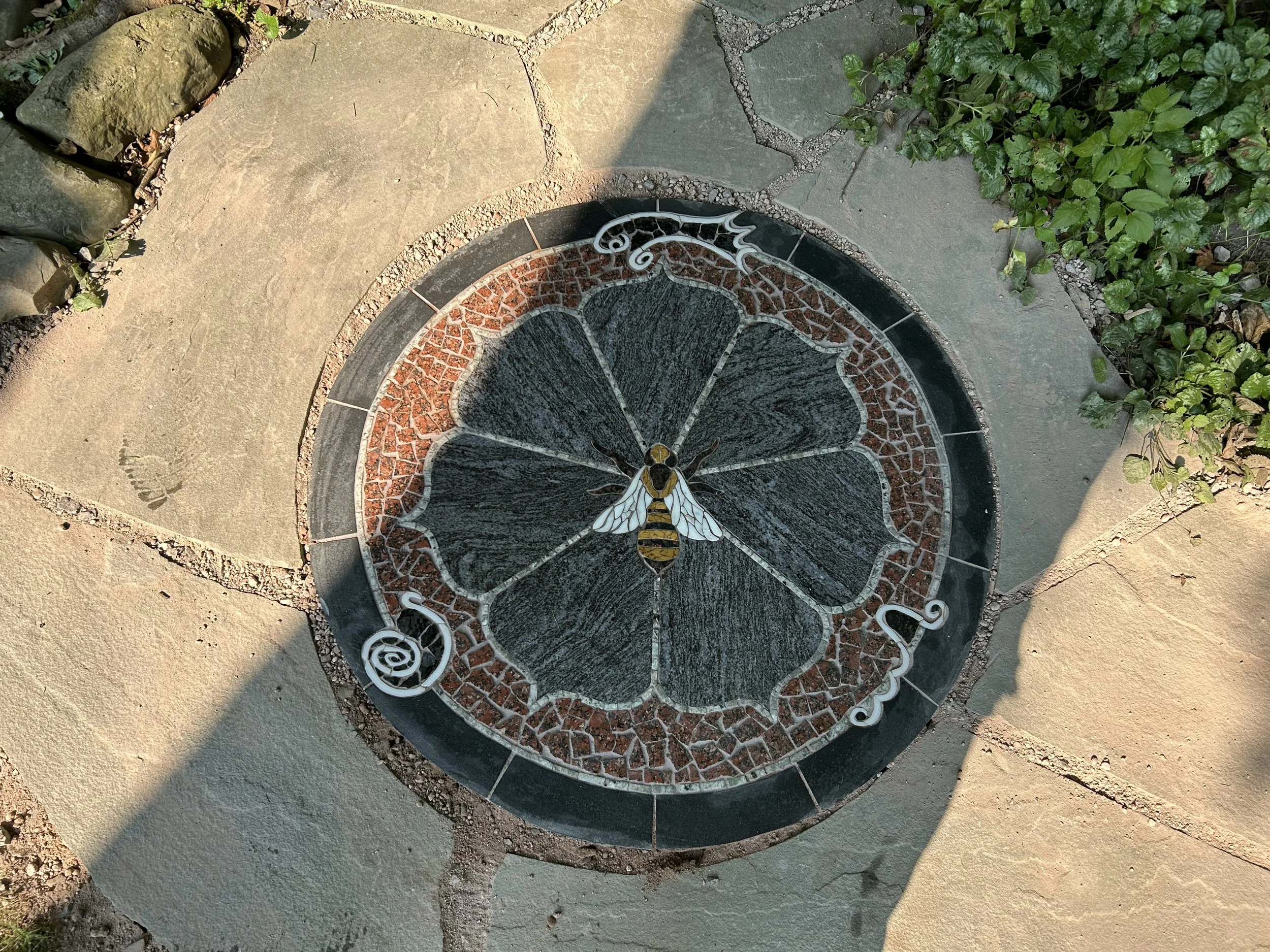 This garden path begins with a stone mosaic of a queen bee within a flower with seven petals. Three bio geometry signatures, surround the flower promoting health of the subtle energy fields around them.